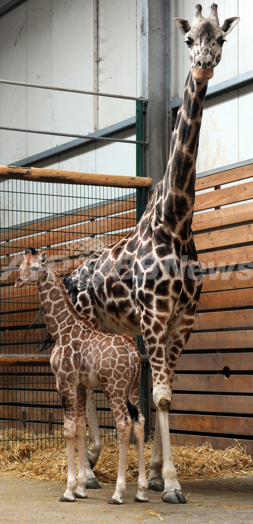 ドイツの動物園で飼育されている赤ちゃんキリン。北部ヤーダーベルク(Jaderberg)の動物園で飼育されているジャミロ(Jamiro)は先月23日に生まれた。西部ドルトムント(Dortmund)の動物園で生まれた赤ちゃんキリンにはまだ名前がなく、現在名付け親を募集中だ。写真はヤーダーベルクの動物園で、母親アルーシャ(Arusha)の横に立つ、ジャミロ(2013年3月23日撮影)。(c)AFP/INGO WAGNER