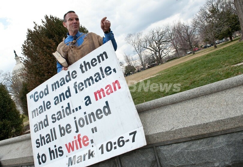 米国では9つの州と首都ワシントンD.C.(Washington D.C.)で同性婚が認められている。賛成派の間には最高裁の判断によって同性婚が全米で認められるようになって欲しいという声がある一方、反対派は各州の議会の判断に委ねるべきだとしている。(c)AFP/Chantal Valery and Robert MacPherson