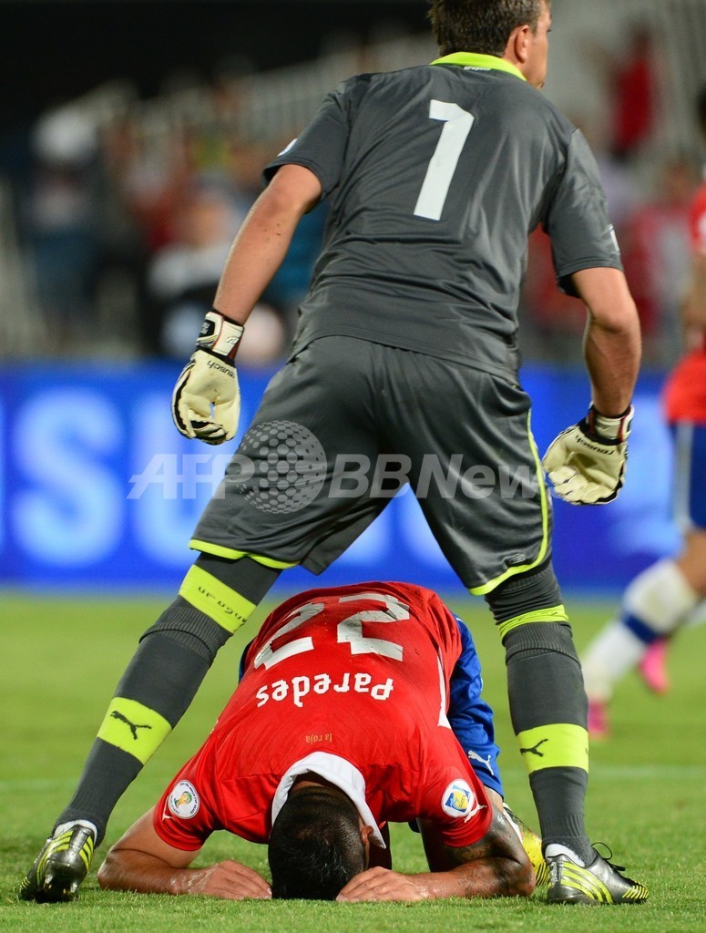 ピッチにしゃがみ込むチリのエステバン・パレデス(Esteban Paredes、下、2013年3月26日撮影)。(c)AFP/MARTIN BERNETTI