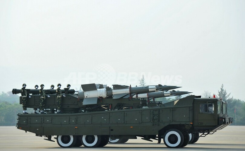 写真は軍事パレードで、武装車両に乗って行進する兵士たち(2013年3月27日撮影)。(c)AFP/NYEIN CHAN NAING