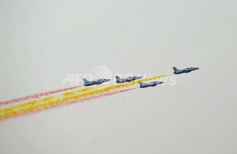 写真は軍事パレードで、上空を飛行する戦闘機(2013年3月27日撮影)。(c)AFP/NYEIN CHAN NAING