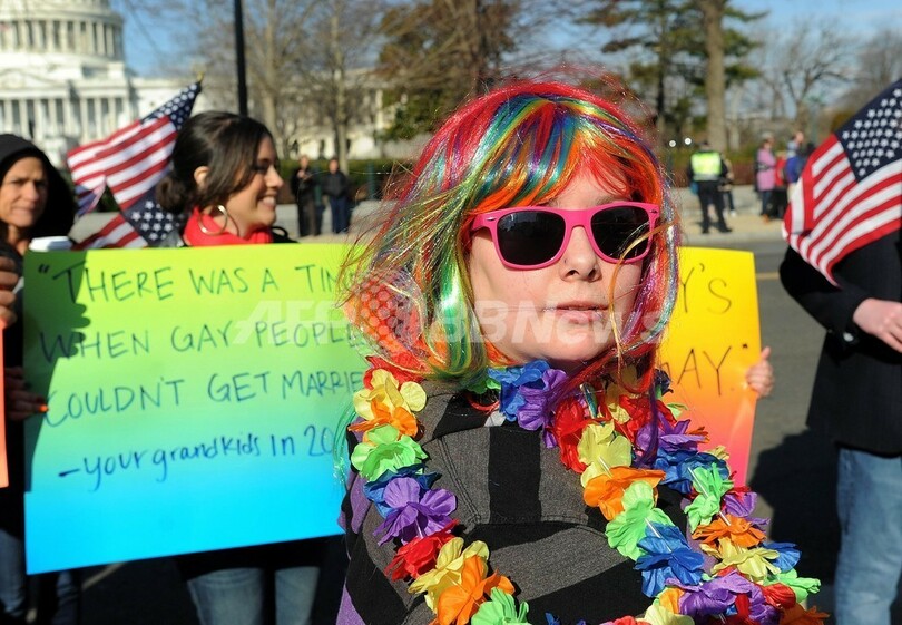 【3月 28日 AFP】米連邦最高裁は、同性婚の是非を問う審理2日目の27日、結婚は男女間のものに限ると定義した連邦法「結婚防衛法(Defense of Marriage Act、DOMA)」の合憲性について審理した。9人の判事のうち5人が同法は違憲という判断に傾いているもようだ。