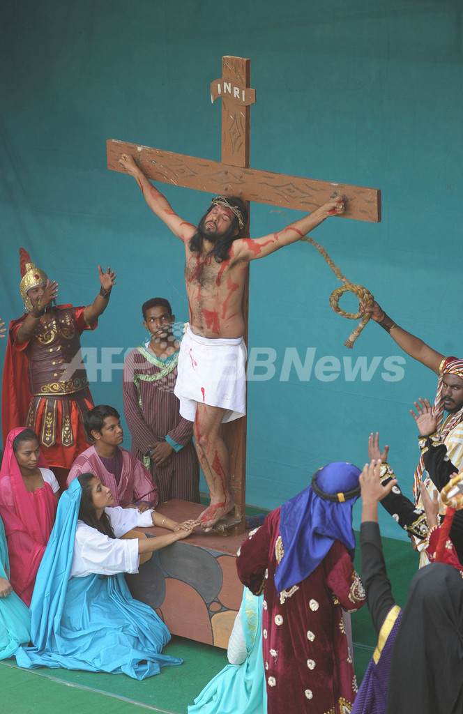 写真は、インド・セクンデラバード(Secunderabad)の教会でキリスト受難劇を演じる人たち(2013年3月29日撮影)。(c)AFP/Noah SEELAM