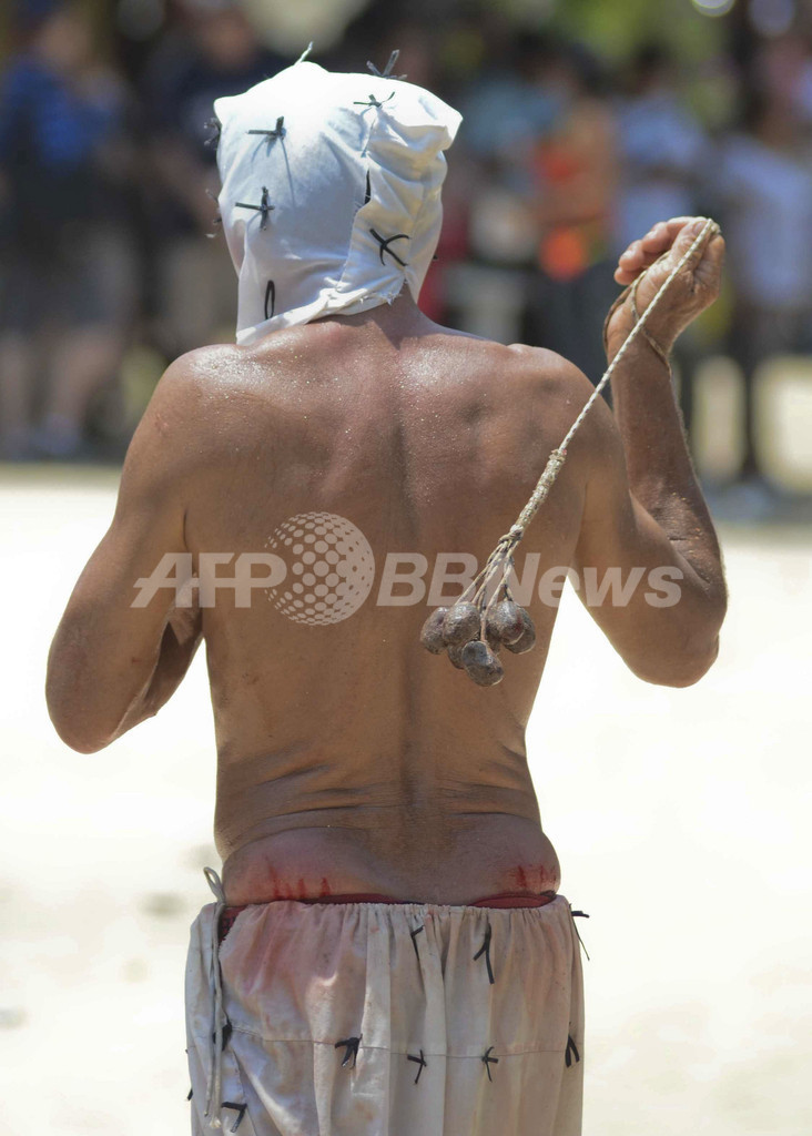 写真は、コロンビア・アトランティコ(Atlantico)県のサント・トマス(Santo Tomas)で行われた受難週の儀式で、自らにむち打つ男性(2013年3月29日撮影)。(c)AFP