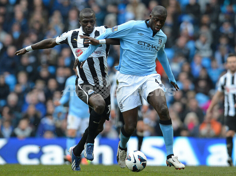 ニューカッスルのムサ・シッソコ(Moussa Sissoko、左)とボールを競るマンチェスター・シティのヤヤ・トゥーレ(Yaya Toure、2013年3月30日撮影)。(c)AFP/ANDREW YATES