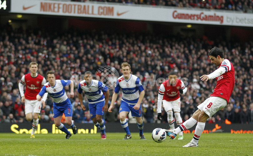 PKから得点を開けるアーセナルのミケル・アルテタ(Mikel Arteta、右、2013年3月30日撮影)。(c)AFP/IAN KINGTON