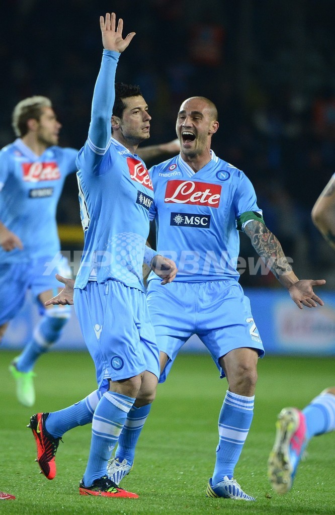 得点を決め喜ぶナポリのブレリム・ジェマイリ(Blerim Demaili、左、2013年3月30日撮影)。(c)AFP/OLIVIER MORIN