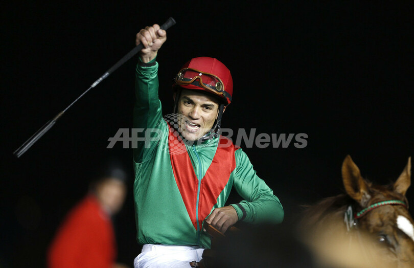 レースを制して歓喜するアニマルキングダムのジョエル・ロザリオ(Joel Rosario)騎手(2013年3月30日撮影)。(c)AFP/MARWAN NAAMANI