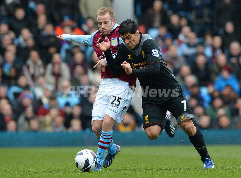 ボールを競るアストン・ビラのバリー・バナン(Barry Bannan、左)とリバプールのルイス・スアレス(Luis Suarez、2013年3月31日撮影)。(c)AFP/ANDREW YATES