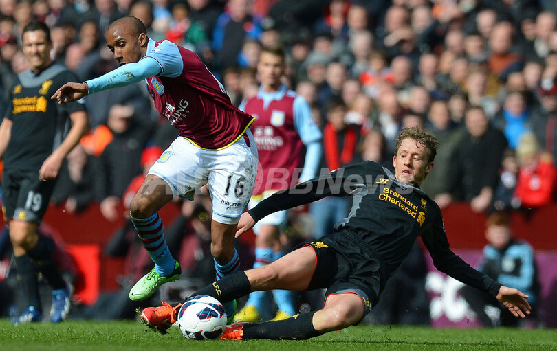 ボールを競るアストン・ビラのファビアン・デルフ(Fabian Delph、左)とリバプールのルーカス・ペッツィーニ・レイヴァ (Lucas Pezzini Leiva、2013年3月31日撮影)。(c)AFP/ANDREW YATES