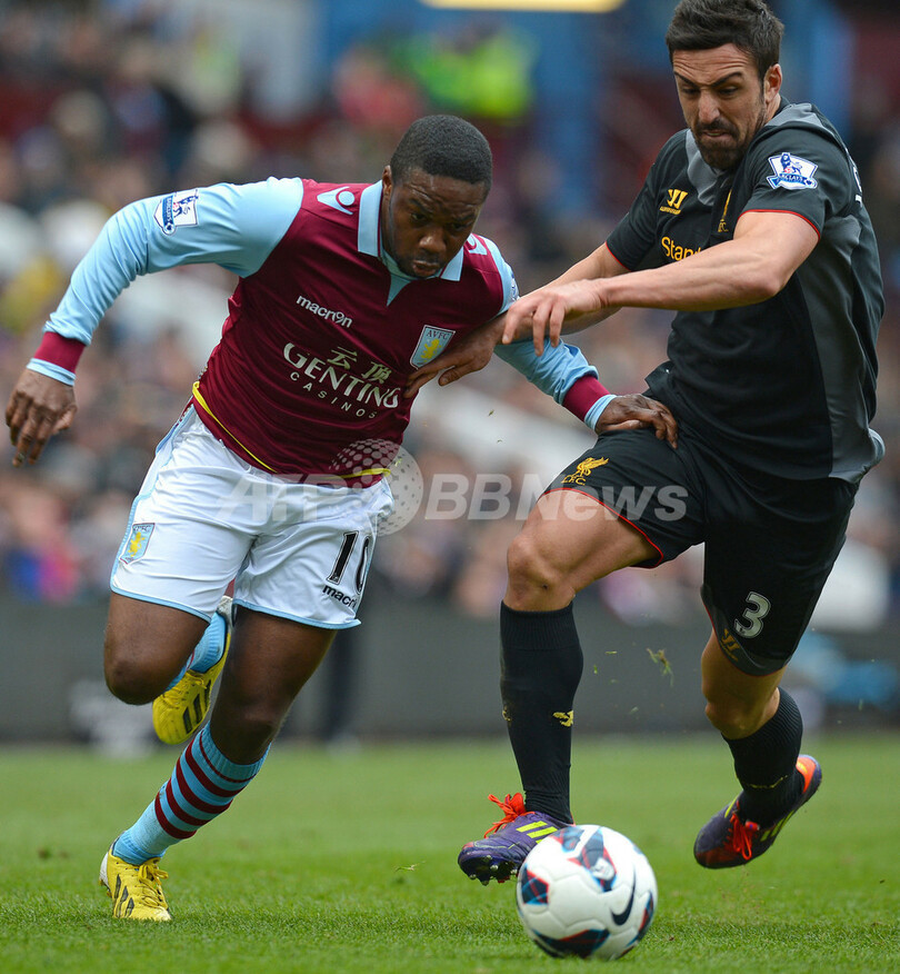ボールを競るアストン・ビラのチャールズ・ヌゾグビア(Charles N'Zogbia、左)とリバプールのホセ・エンリケ(Jose Enrique、2013年3月31日撮影)。(c)AFP/ANDREW YATES
