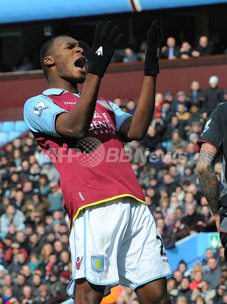 得点を挙げ喜ぶアストン・ビラのクリスティアン・ベンテケ(Christian Benteke、2013年3月31日撮影)。(c)AFP/ANDREW YATES