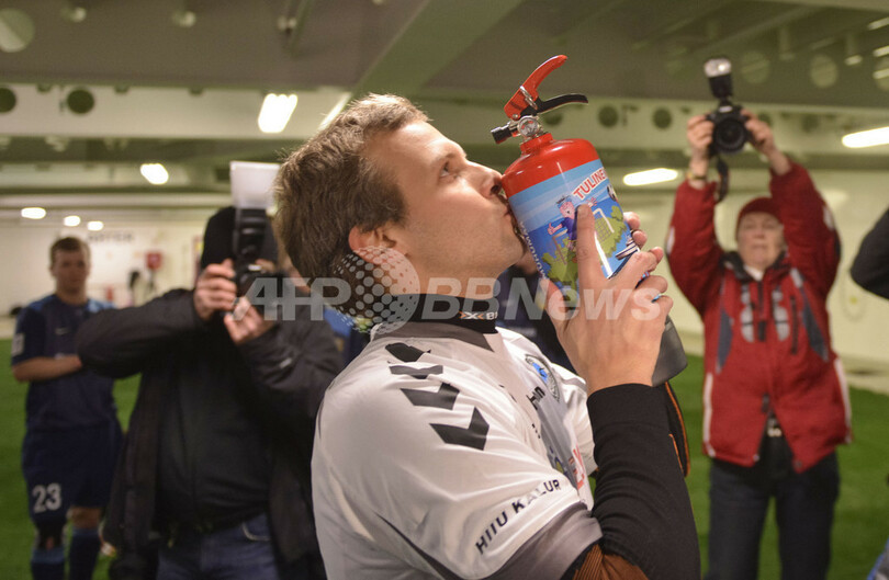 写真は、ヒーウマー島からエストニア本土へ向かうフェリー内で、サッカーの試合後に「優勝カップ」の消火器にキスをする選手(2013年3月30日撮影)。(c)AFP/RAIGO PAJULA