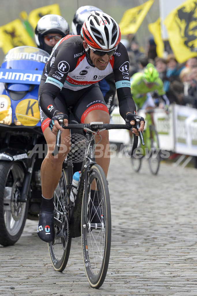 優勝候補だったオメガファルマ・クイックステップ(Omega Pharma-Quick Step)のトム・ボーネン(Tom Boonen、ベルギー)はスタートから19キロメートル地点でクラッシュし、レースから退いた。ボーネンは病院に運ばれ、ひじ、左臀部(でんぶ)、右膝に負ったけがの治療を受けたが、レントゲン検査の結果、骨折はしていないことが判明した。(c)AFP
