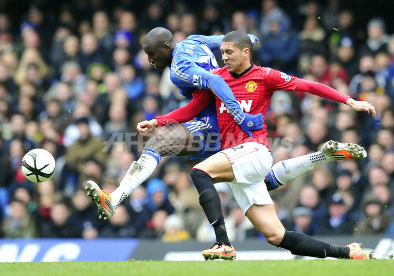 マンチェスター・ユナイテッドのクリス・スモーリング(Chris Smalling、右)とボールを競るチェルシーのデンバ・バ(Demba Ba、2013年4月1日撮影)。(c)AFP/GLYN KIRK