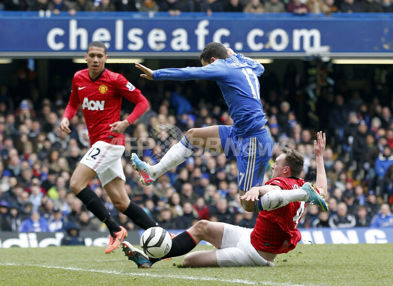マンチェスター・ユナイテッドのフィル・ジョーンズ(Phil Jones、下)からタックルを受けるチェルシーのエデン・アザール(Eden Hazard、中央、2013年4月1日撮影)。(c)AFP/IAN KINGTON