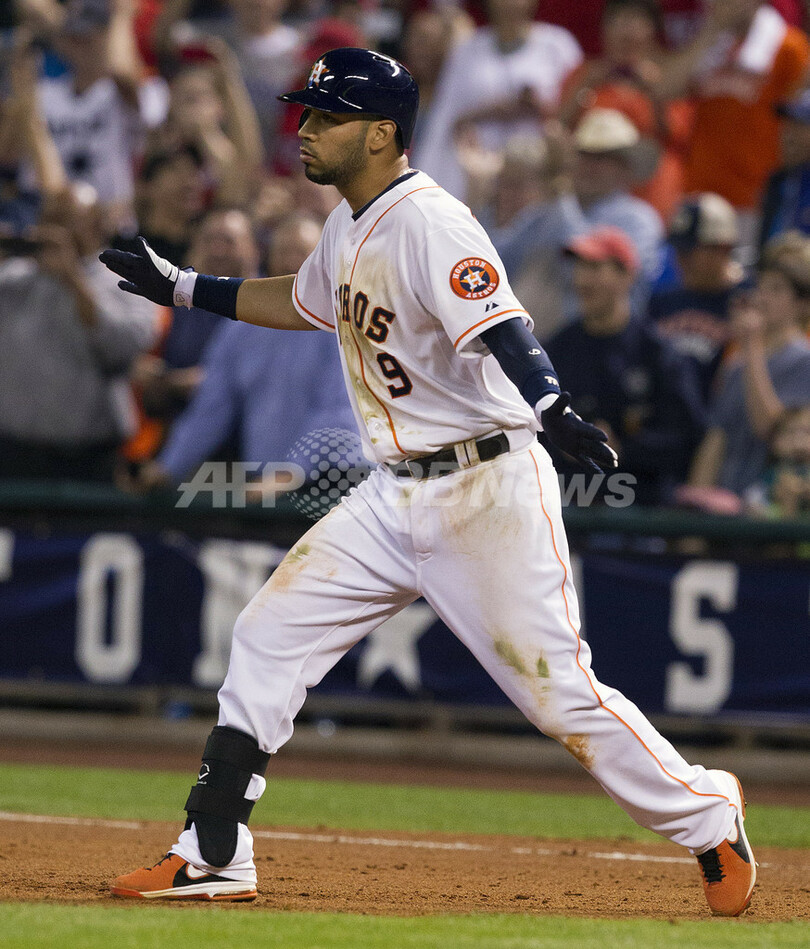 チーム初安打を放ち歓喜するヒューストン・アストロズのマーウィン・ゴンザレス(Marwin Gonzalez、2013年4月2日撮影)。(c)AFP/Getty Images/Bob Levey