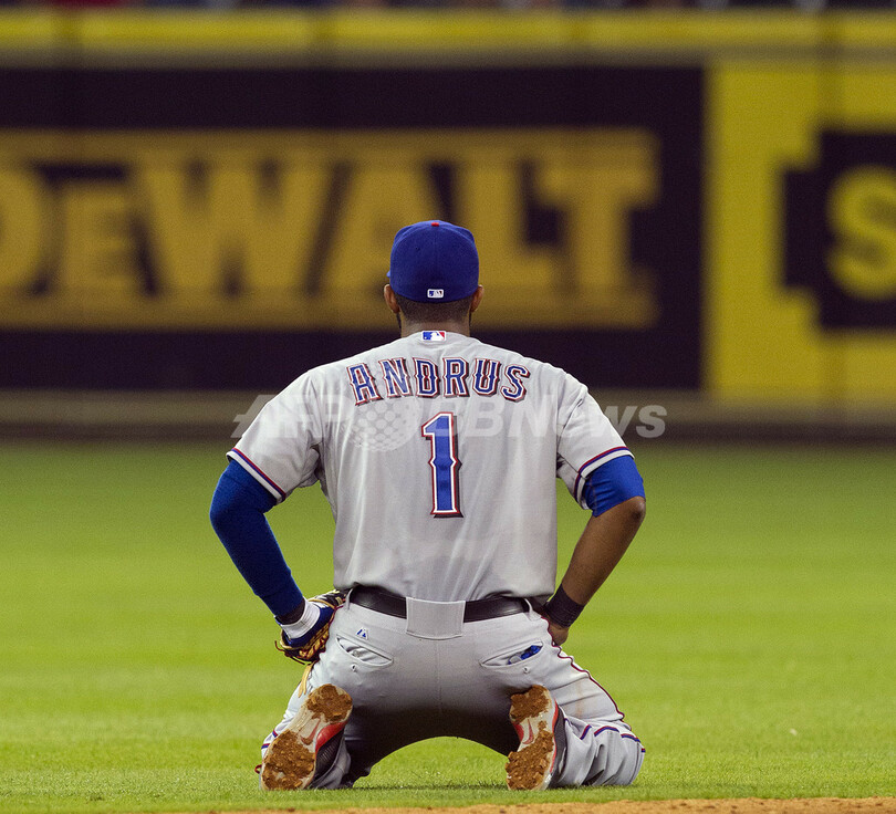 ヒューストン・アストロズのマーウィン・ゴンザレス(Marwin Gonzalez、写真外)に安打を許し、打球の転がった中堅方向を向いて膝をつくテキサス・レンジャーズのエルビス・アンドラス(Elvis Andrus、2013年4月2日撮影)。(c)AFP/Getty Images/Bob Levey