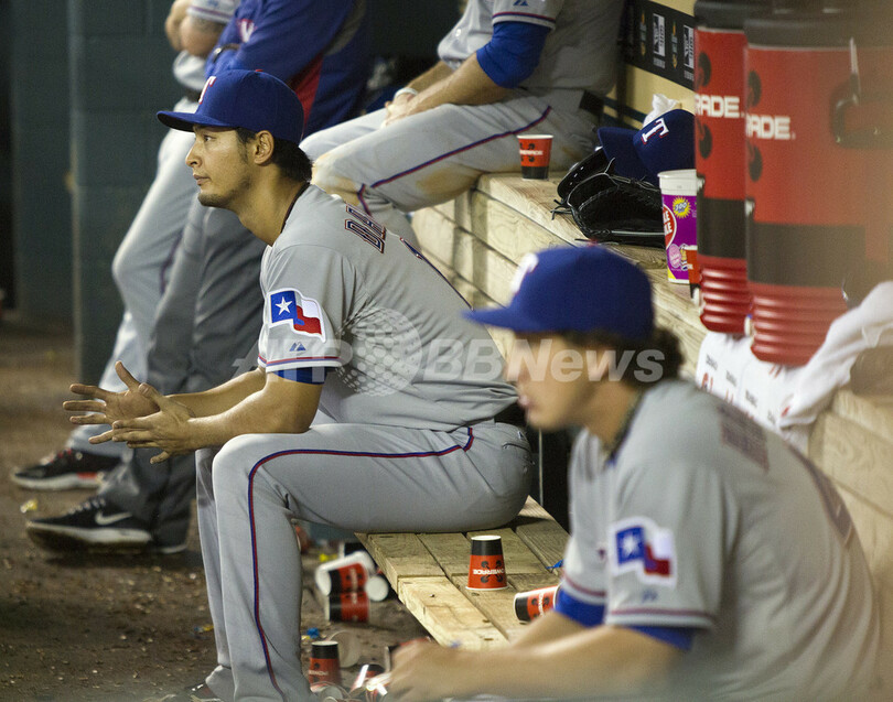 初安打を許し、降板してダグアウトから戦況を見守るテキサス・レンジャーズのダルビッシュ有(2013年4月2日撮影)。(c)AFP/Getty Images/Bob Levey