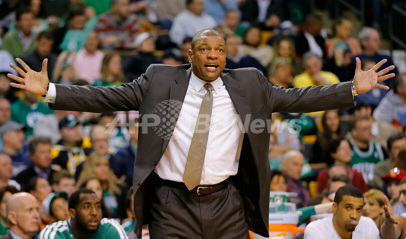 判定に不満を表すボストン・セルティックスのドック・リバース(Doc Rivers)HC(2013年4月3日撮影)。(c)AFP/Getty Images/Jared Wickerham