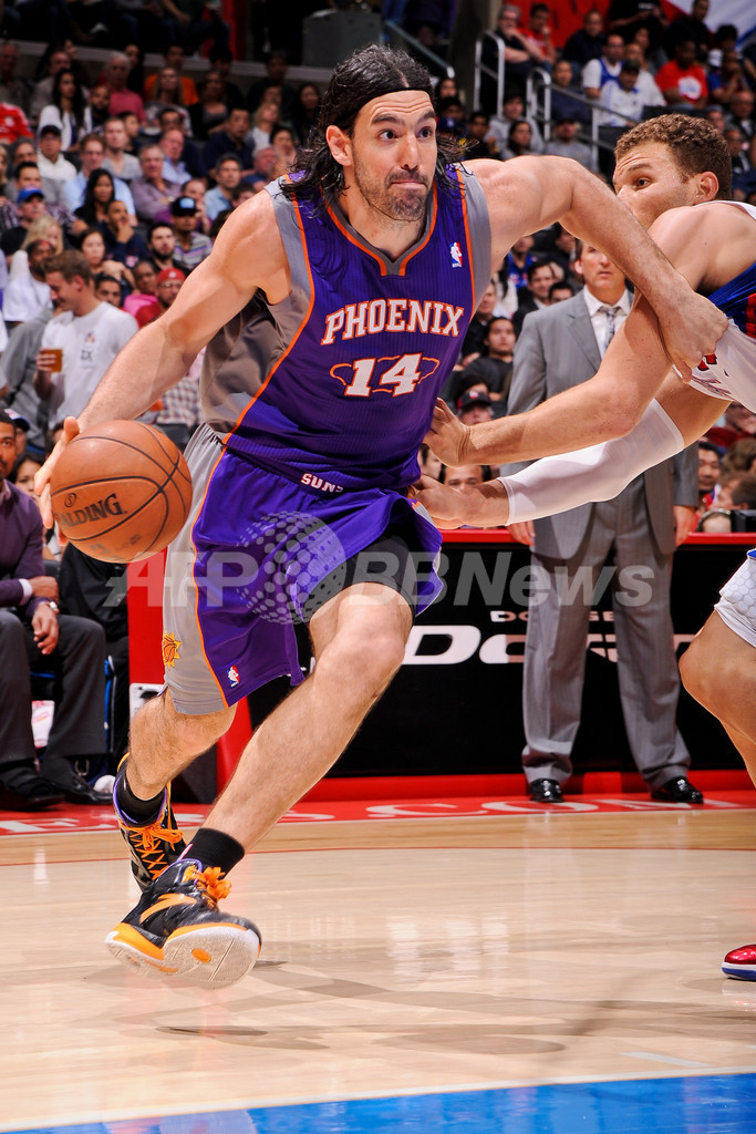 ドライブを仕掛けるフェニックス・サンズのルイス・スコラ(Luis Scola、2013年4月3日撮影)。(c)AFP/Getty Images/NBAE/Andrew D. Bernstein