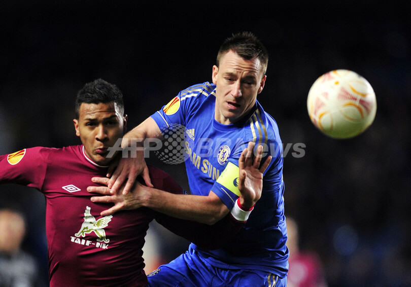 ルビン・カザニのホセ・サロモン・ロンドン(Jose Salomon Rondon、左)とボールを競るチェルシーのジョン・テリー(John Terry、2013年4月4日撮影)。(c)AFP/GLYN KIRK