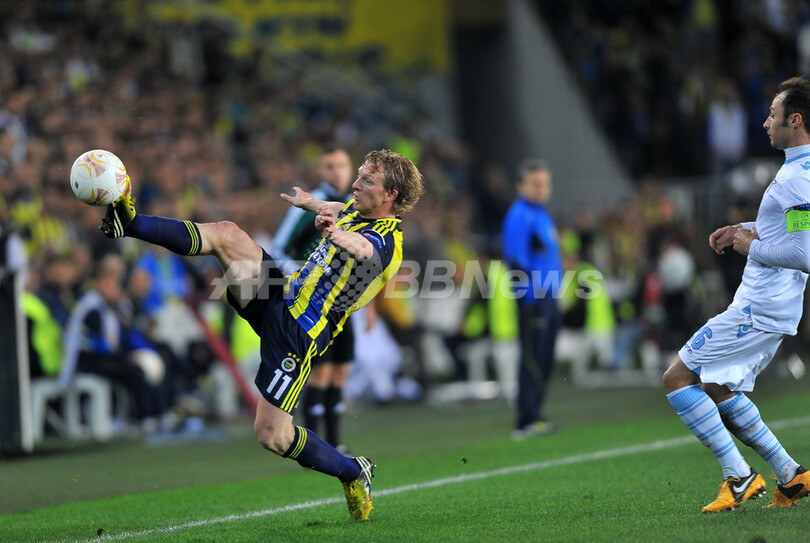 フェネルバフチェは後半33分にアチール・ピエール・ウェボ(Achille Pierre Webo)のPKで先制すると、試合終了間際にはディルク・カイト(Dirk Kuyt)が追加点を挙げ、準決勝進出へ優位に立った。(c)AFP