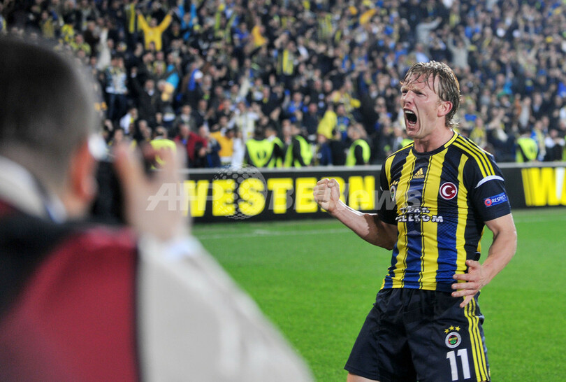 後半ロスタイムにチーム2得点目を挙げて歓喜するフェネルバフチェのディルク・カイト(Dirk Kuyt、2013年4月4日撮影)。(c)AFP/OZAN KOSE