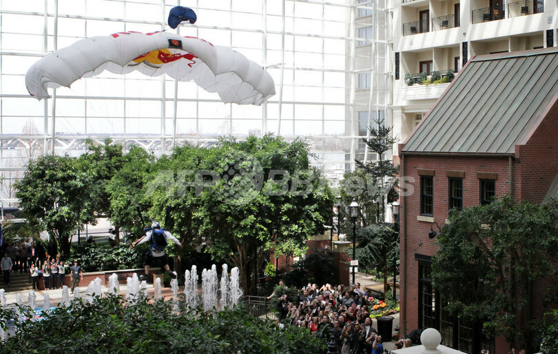 ベースジャンプは、高い建造物や断崖などからパラシュートなどで飛び降りるスポーツだ。高さ3300メートルからのジャンプ経験もあるダイシャーさんだが、屋内でのベースジャンプは初めて。9月にナショナルハーバーでレッドブル(Red Bull)の主催で行われる手作り飛行機大会のプロモーションの一環として挑戦し、見事成功した。(c)AFP
