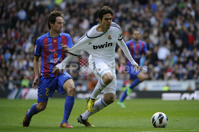 レバンテのミチェル(Miguel Alfonso Herrero Javaloyas 'Michel'、左)とボールを競るレアル・マドリードのカカ(Kaka、2013年4月6日撮影)。(c)AFP/PEDRO ARMESTRE