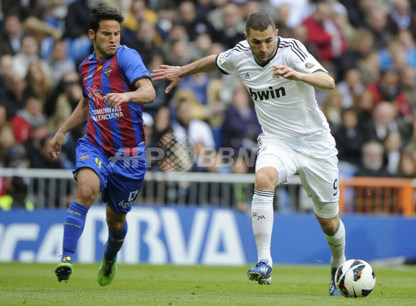 レバンテのルベン・ガルシア(Ruben Garcia Santos、左)を抑えボールを運ぶレアル・マドリードのカリム・ベンゼマ(Karim Benzema、2013年4月6日撮影)。(c)AFP/PEDRO ARMESTRE