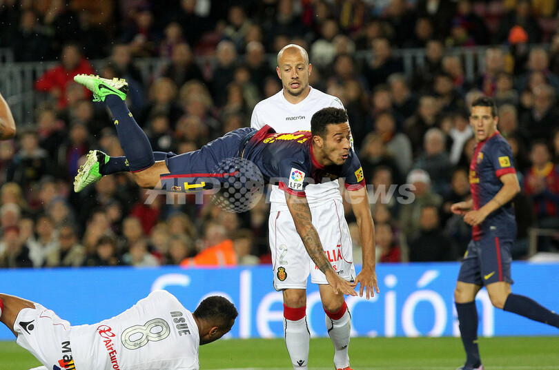 ボールを競るマジョルカのエミリオ・ヌスエ(Emilio Nsue、左下)とFCバルセロナのティアゴ・アルカンタラ(Thiago Alcantara do Nascimento、中央、2013年4月6日撮影)。(c)AFP/QUIQUE GARCIA