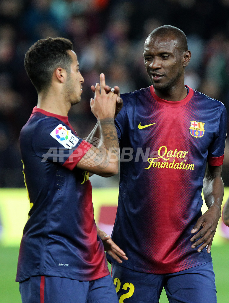 試合後、チームメイトのティアゴ・アルカンタラ(Thiago Alcantara do Nascimento、左)と言葉を交わすFCバルセロナのエリック・アビダル(Eric Abidal、2013年4月6日撮影)。(c)AFP/QUIQUE GARCIA