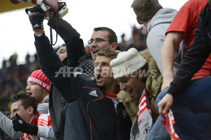試合後、サポーターとともにリーグ制覇を祝うバイエルン・ミュンヘンのトーマス・ミュラー(Thomas Mueller、中央、2013年4月6日撮影)。(c)AFP/CHRISTOF STACHE