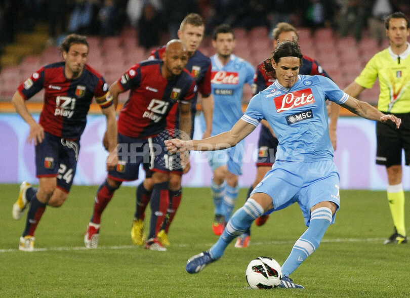 PKを蹴るナポリのエディンソン・カヴァーニ(Edinson Cavani、2013年4月7日撮影)。(c)AFP/ROBERTO SALOMONE