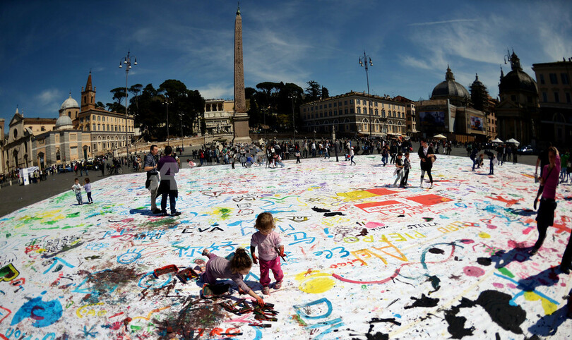 【4月8日 AFP】イタリア・ローマ(Rome)のポポロ広場(Piazza del Popolo)で7日、市の文化協会「キッチン・アート(Kitchen Art)」主催のイベント「家族にとって良いことは、国にとっても良いこと」が開催された。広場に広げられた巨大なキャンバスに多くの子どもたちが筆を走らせた。このイベントは、ローマを家庭に優しい都市にすることを目的にしている。(c)AFP