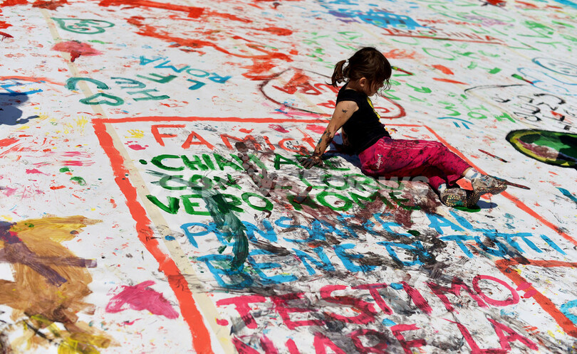 【4月8日 AFP】イタリア・ローマ(Rome)のポポロ広場(Piazza del Popolo)で7日、市の文化協会「キッチン・アート(Kitchen Art)」主催のイベント「家族にとって良いことは、国にとっても良いこと」が開催された。広場に広げられた巨大なキャンバスに多くの子どもたちが筆を走らせた。このイベントは、ローマを家庭に優しい都市にすることを目的にしている。(c)AFP