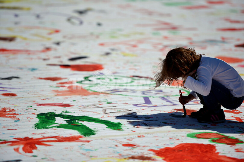 イタリア・ローマ(Rome)のポポロ広場(Piazza del Popolo)で7日、市の文化協会「キッチン・アート(Kitchen Art)」主催のイベント「家族にとって良いことは、国にとっても良いこと」が開催された。広場に広げられた巨大なキャンバスに多くの子どもたちが筆を走らせた。このイベントは、ローマを家庭に優しい都市にすることを目的にしている。写真は、ポポロ広場に広げられた巨大なキャンバスに自由に絵を描く子ども(2013年4月7日撮影)。(c)AFP/GABRIEL BOUYS