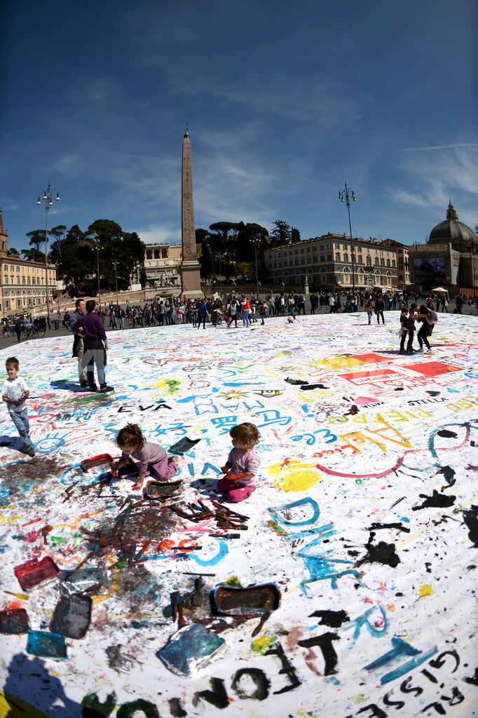 イタリア・ローマ(Rome)のポポロ広場(Piazza del Popolo)で7日、市の文化協会「キッチン・アート(Kitchen Art)」主催のイベント「家族にとって良いことは、国にとっても良いこと」が開催された。広場に広げられた巨大なキャンバスに多くの子どもたちが筆を走らせた。このイベントは、ローマを家庭に優しい都市にすることを目的にしている。写真は、ポポロ広場に広げられた巨大なキャンバスに自由に絵を描く子どもたち(2013年4月7日撮影)。(c)AFP/GABRIEL BOUYS