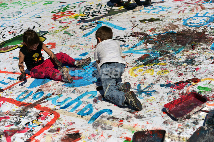 イタリア・ローマ(Rome)のポポロ広場(Piazza del Popolo)で7日、市の文化協会「キッチン・アート(Kitchen Art)」主催のイベント「家族にとって良いことは、国にとっても良いこと」が開催された。広場に広げられた巨大なキャンバスに多くの子どもたちが筆を走らせた。このイベントは、ローマを家庭に優しい都市にすることを目的にしている。写真は、ポポロ広場に広げられた巨大なキャンバスに自由に絵を描く子どもたち(2013年4月7日撮影)。(c)AFP/GABRIEL BOUYS