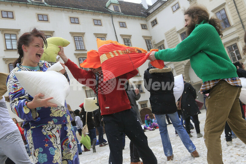 【4月8日 AFP】「国際ピローファイト・デー(International Pillow Fight Day)」の6日、ロンドン(London)やオーストリア首都ウィーン(Vienna)で、枕でたたき合って戦う「ピローファイト」のイベントが行われた。(c)AFP