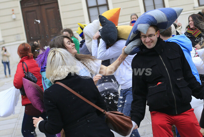 【4月8日 AFP】「国際ピローファイト・デー(International Pillow Fight Day)」の6日、ロンドン(London)やオーストリア首都ウィーン(Vienna)で、枕でたたき合って戦う「ピローファイト」のイベントが行われた。(c)AFP