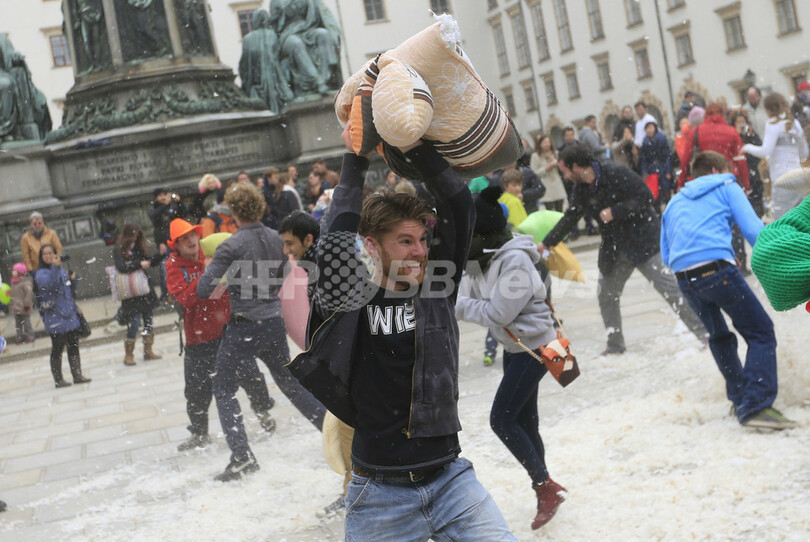 【4月8日 AFP】「国際ピローファイト・デー(International Pillow Fight Day)」の6日、ロンドン(London)やオーストリア首都ウィーン(Vienna)で、枕でたたき合って戦う「ピローファイト」のイベントが行われた。(c)AFP