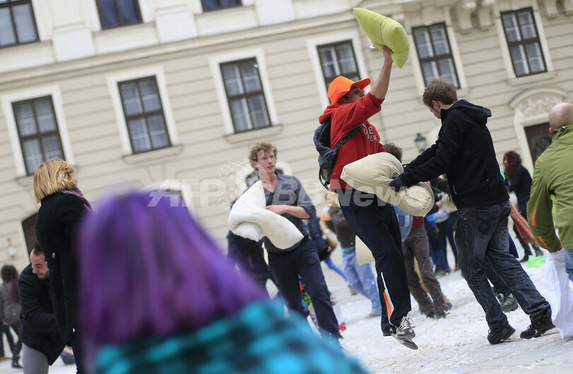 【4月8日 AFP】「国際ピローファイト・デー(International Pillow Fight Day)」の6日、ロンドン(London)やオーストリア首都ウィーン(Vienna)で、枕でたたき合って戦う「ピローファイト」のイベントが行われた。(c)AFP