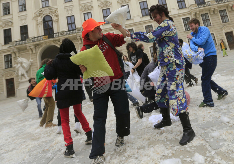 【4月8日 AFP】「国際ピローファイト・デー(International Pillow Fight Day)」の6日、ロンドン(London)やオーストリア首都ウィーン(Vienna)で、枕でたたき合って戦う「ピローファイト」のイベントが行われた。(c)AFP