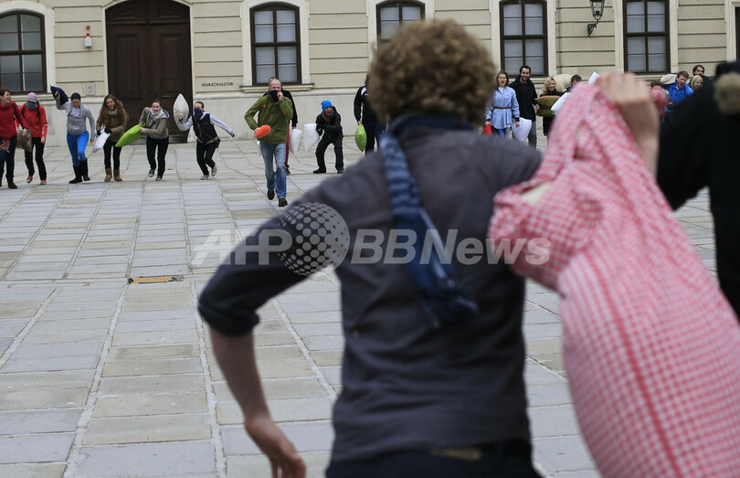 【4月8日 AFP】「国際ピローファイト・デー(International Pillow Fight Day)」の6日、ロンドン(London)やオーストリア首都ウィーン(Vienna)で、枕でたたき合って戦う「ピローファイト」のイベントが行われた。(c)AFP
