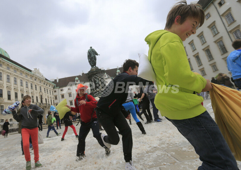 【4月8日 AFP】「国際ピローファイト・デー(International Pillow Fight Day)」の6日、ロンドン(London)やオーストリア首都ウィーン(Vienna)で、枕でたたき合って戦う「ピローファイト」のイベントが行われた。(c)AFP