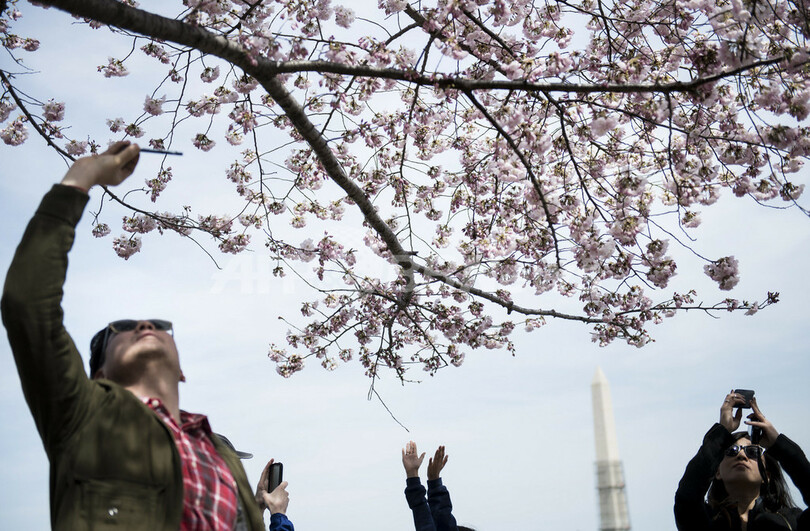 【4月8日 AFP】米ワシントンD.C.(Washington D.C.)の国立公園ナショナルモール(National Mall)では、遅い春の訪れとともに桜が見ごろとなっている。公園内タイダルベイスン(Tidal Basin)には、1912年に旧東京市から友好の印として寄贈された桜もあり、多くの花見客を楽しませている。(c)AFP