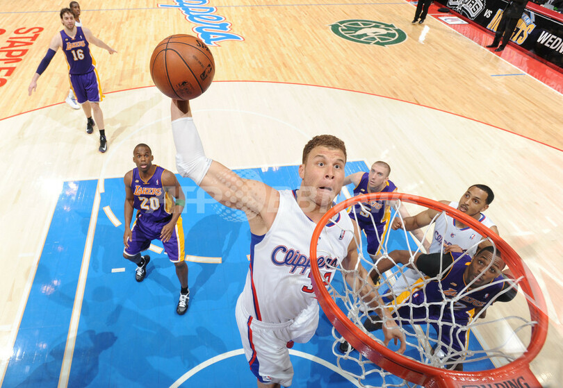 ダンクシュートを狙うクリッパーズのブレイク・グリフィン(Blake Griffin、2013年4月7日撮影)。(c)AFP/Getty Images/NBAE/Andrew D. Bernstein
