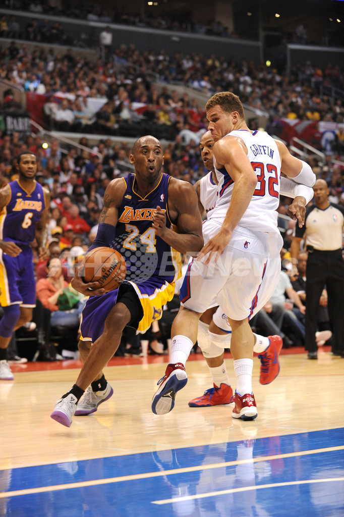クリッパーズのブレイク・グリフィン(Blake Griffin、右)をかわしてドライブで切り込むレイカーズのコービー・ブライアント(Kobe Bryant、2013年4月7日撮影)。(c)AFP/Getty Images/NBAE/Noah Graham
